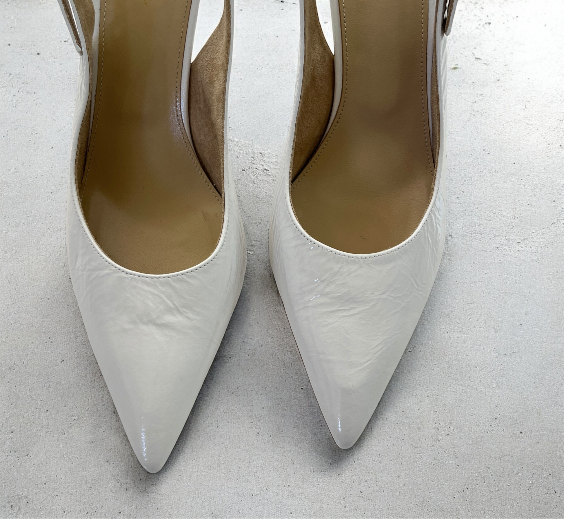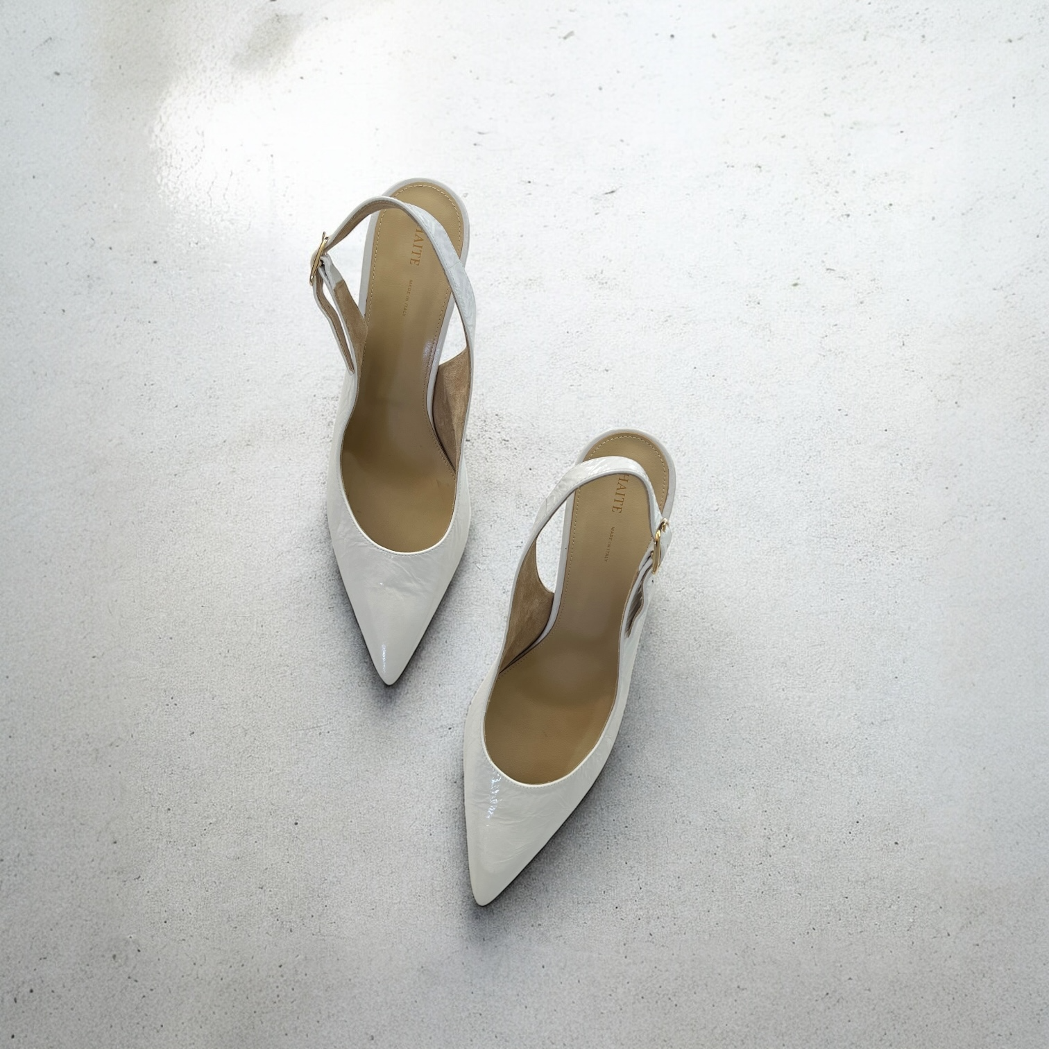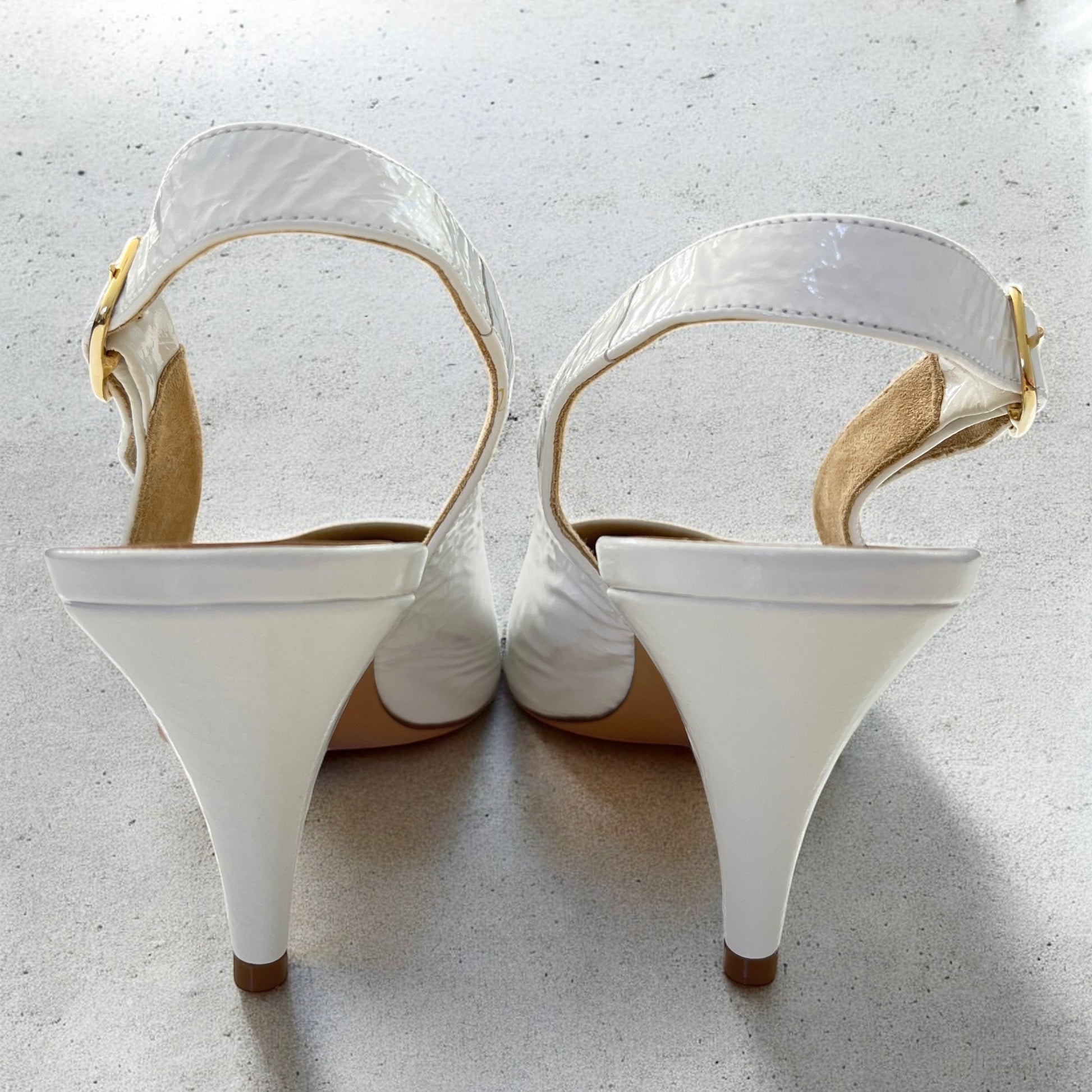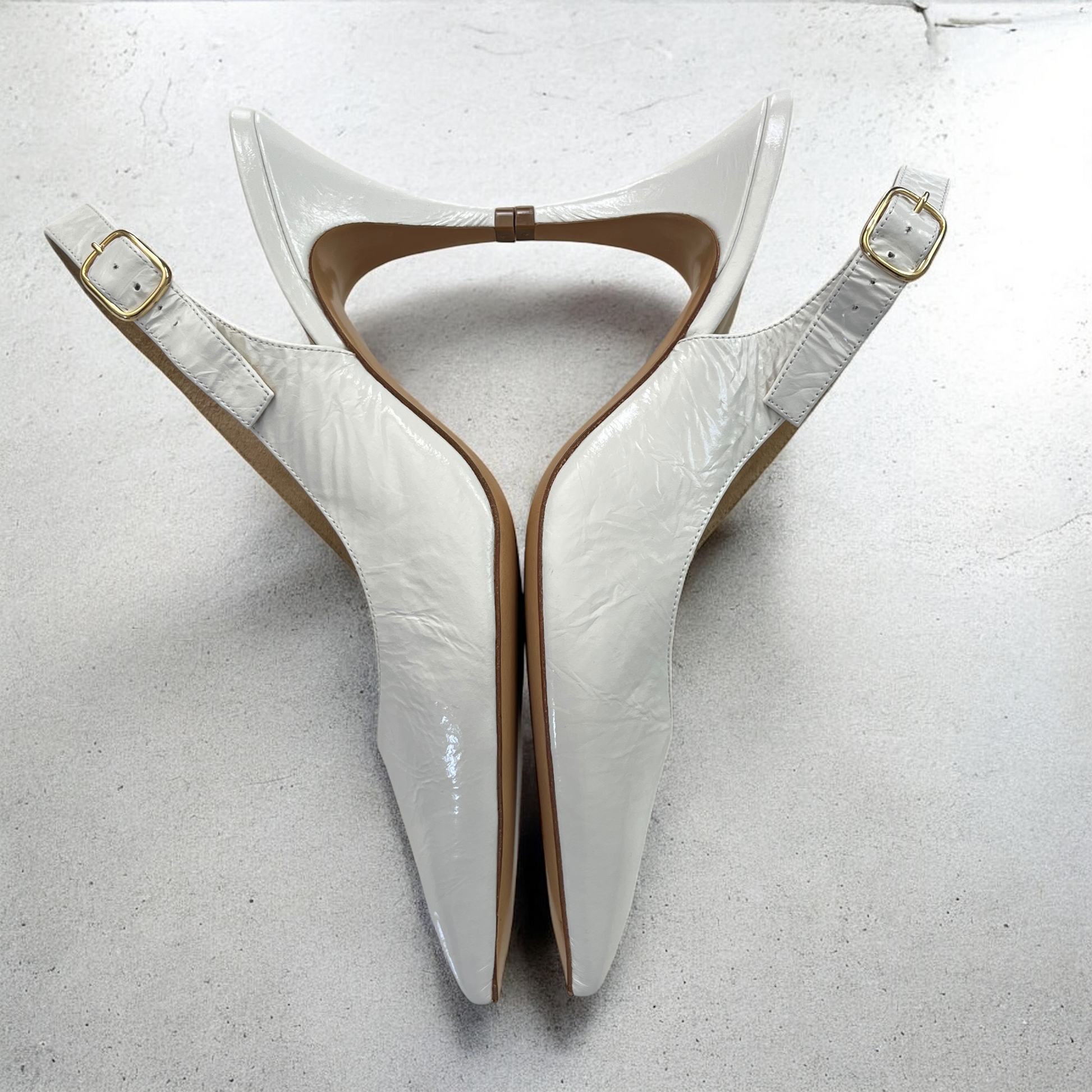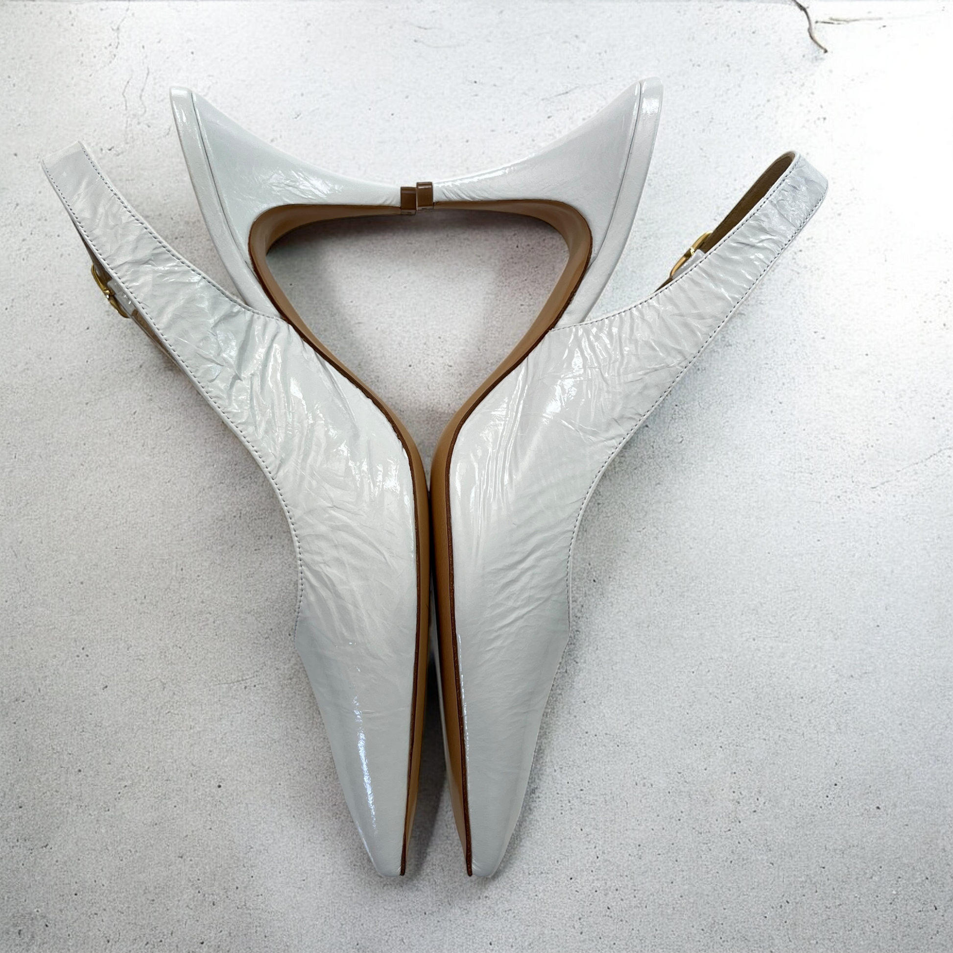 Crinkled leather upper with leather sole. Made in Italy. Sling-back styling with adjustable buckled strap. Leather footbed with suede lining. Pointed toe. Approx 75mm/ 3 inch heel. Our Style No. KTAH-WZ116. Manufacturer Style No. F2032-858.